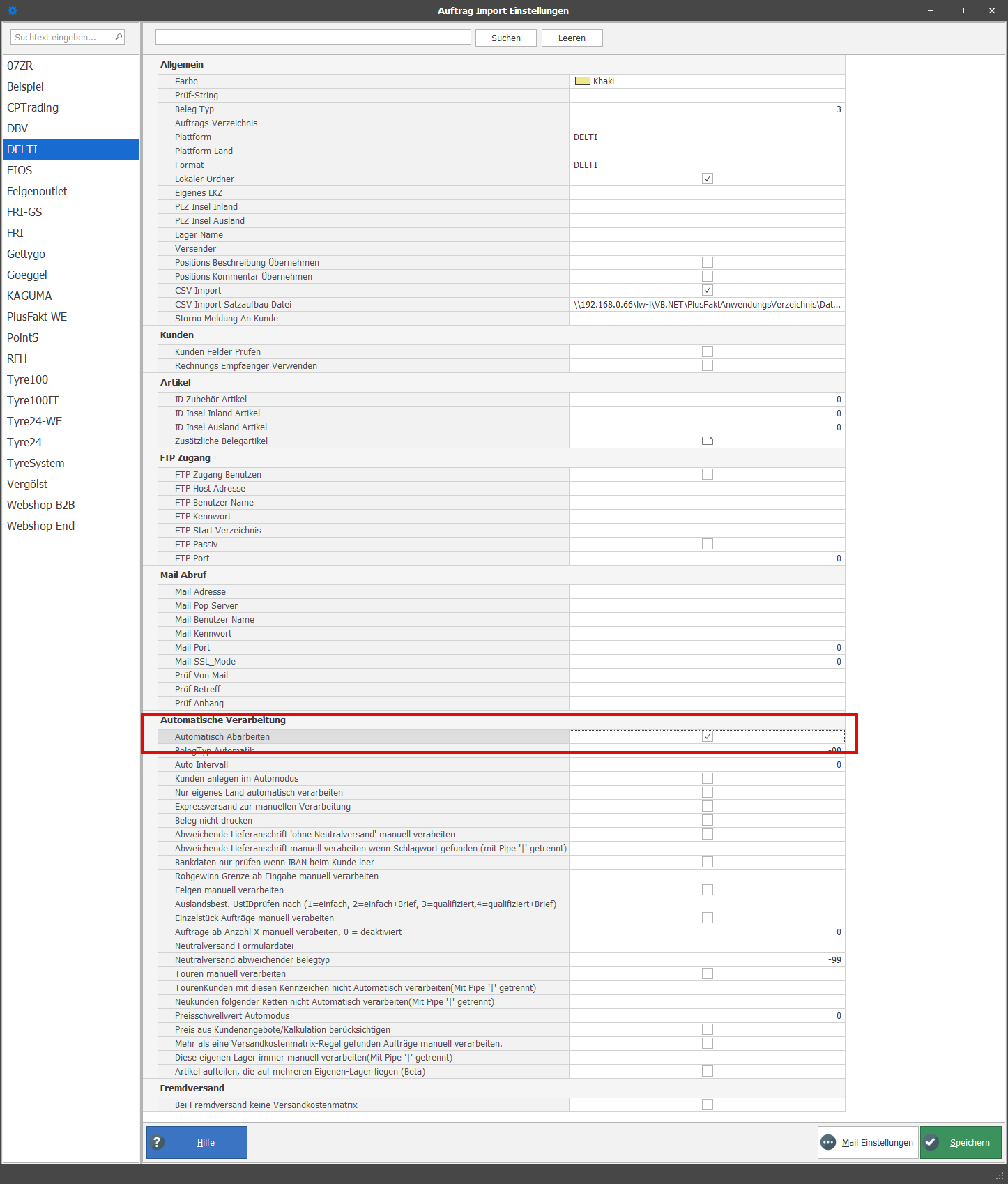 Im Reiter "Import/Export/Update" finden Sie die "Auftragsimport Einstellungen", die sie zur Konfiguration des automatischen Auftragsimport öffnen. Klicken Sie nun hier z.B. den Punkt DELTI an (siehe Bild):