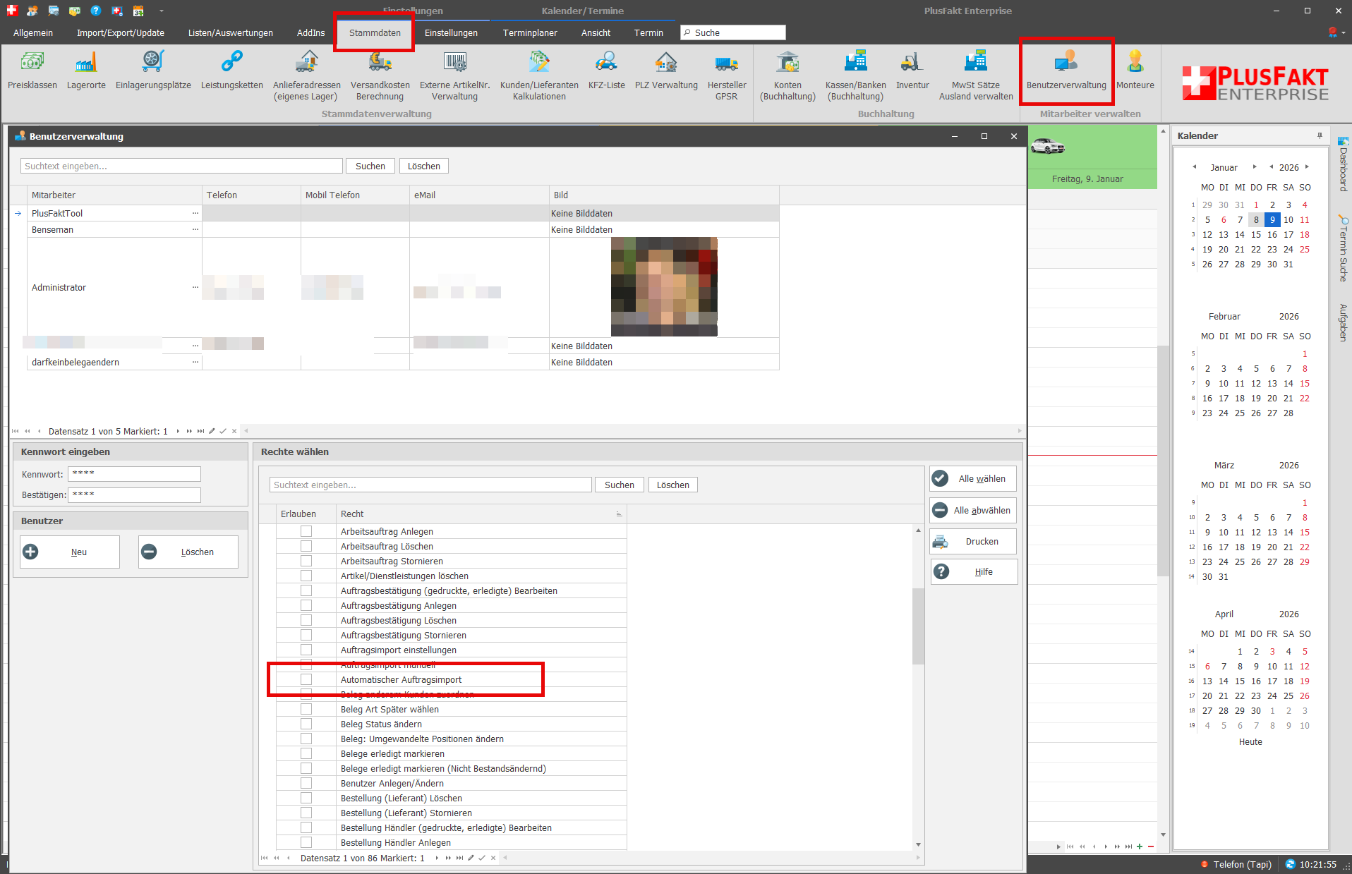 Im Reiter "Stammdaten", dort unter dem Punkt "Benutzerverwaltung" legen Sie den neuen Benutzer für den automatischen Auftragsimport an und vergeben ihm das Recht "Automatischer Auftragsimport". Das bedeutet, es muss ein neuer Benutzer mit Passwort angelegt werden . Dieser Benutzer bekommt nur das Recht "Automatischer Auftragsimport" Bedenken Sie das der Name des Benutzer im Verkäufer Feld des Beleges angezeigt wird und später auch für weitere Schnittstellen verwendet wird. Benutzer Namen wie "delti" oder "Autoimport" wären deshalb eine schlechte Wahl!